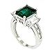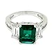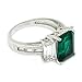 It may be that once upon a time you were not a huge fan of geometry. If so, we suggest you try a new angle of perception... Study and celebrate these gems, in the time-honored rectangular shape, beautifully repeated in various sizes throughout the ring. And now, we dare to ask... are you getting closer to declaring from the roof tops: "I love geometry"?The center stone is an Emerald CZ, measuring approx. 8x10mm (equivalent to over 3 1/4 carats). It is flanked with two White Diamond CZs @ 4x7mm each. All three stones are rectangular, step-cut and prong-set. Each shoulder is adorned with three channel-set White Diamond CZ baguettes. Small pave accents appear on both cross-sections, just below the center stones.Beyond the stones, the band is high polished and 2.5mm wide at the back.